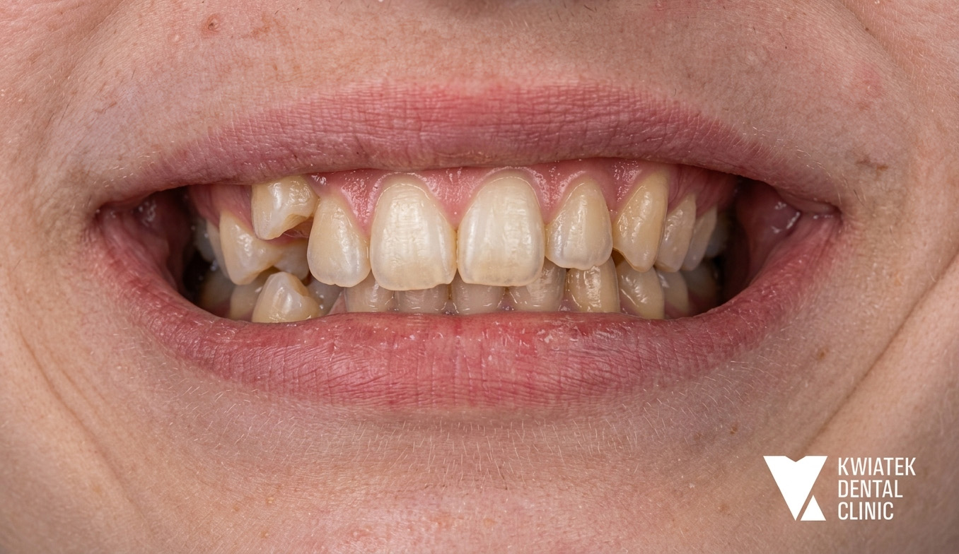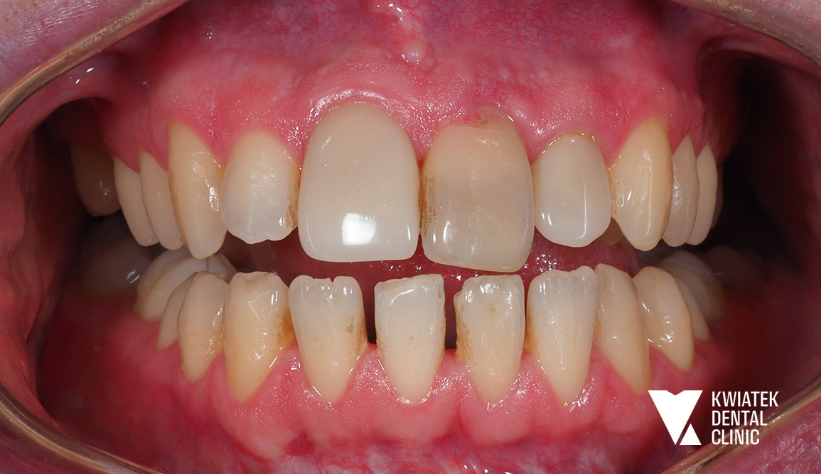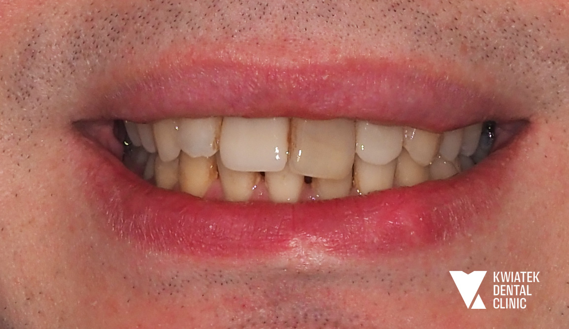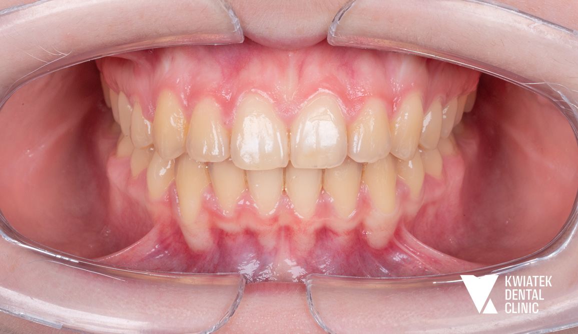 Pan Jakub zgłosił się do kliniki z wadą zgryzu oraz licznymi problemami wynikającymi z nieprawidłowego ustawienia zębów. Leczenie wymagało współpracy specjalistów z kilku dziedzin stomatologii, precyzyjnego planowania oraz konsekwentnej realizacji kolejnych etapów terapii.