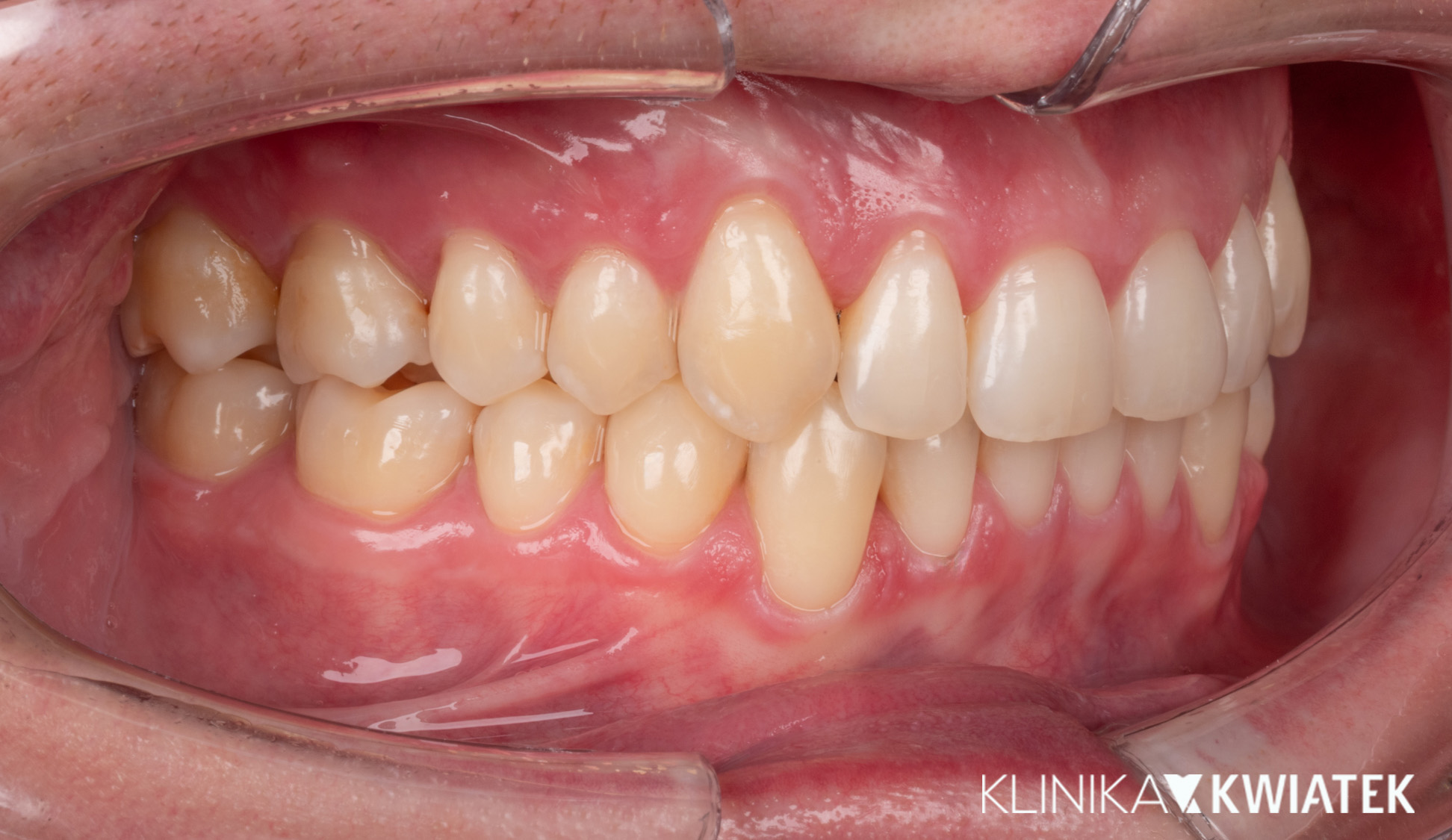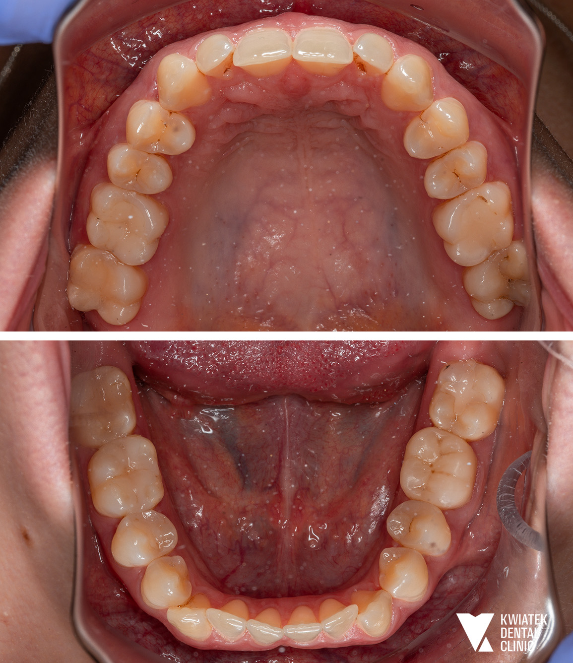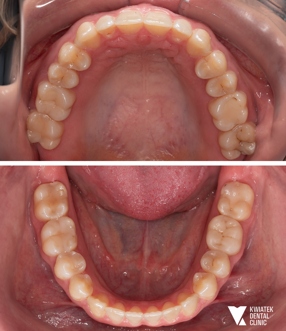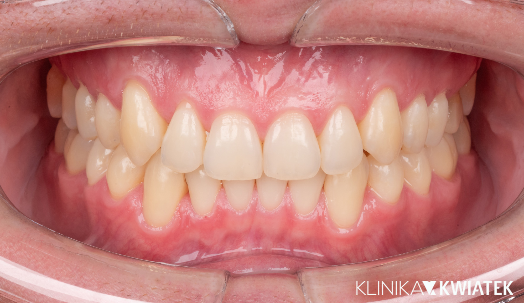 Pacjentka zgłosiła się do kliniki z potrzebą kompleksowej poprawy zarówno funkcji zgryzu, jak i estetyki uśmiechu. W badaniu stwierdzono zgryz krzyżowy, stłoczenia zębów oraz liczne problemy wymagające leczenia zachowawczego i protetycznego, co wymagało wieloetapowego, interdyscyplinarnego podejścia. Terapię poprzedziło staranne przygotowanie jamy ustnej obejmujące ekstrakcję zębów mądrości, profesjonalną higienizację oraz odbudowę osłabionych struktur. Następnie wdrożono zaawansowane leczenie ortodontyczne z wykorzystaniem nowoczesnego systemu nakładkowego. Rezultatem jest harmonijny, stabilny zgryz, idealnie ukształtowane łuki zębowe oraz wyraźnie odmłodzony, jasny uśmiech, podkreślony profesjonalnym wybielaniem.