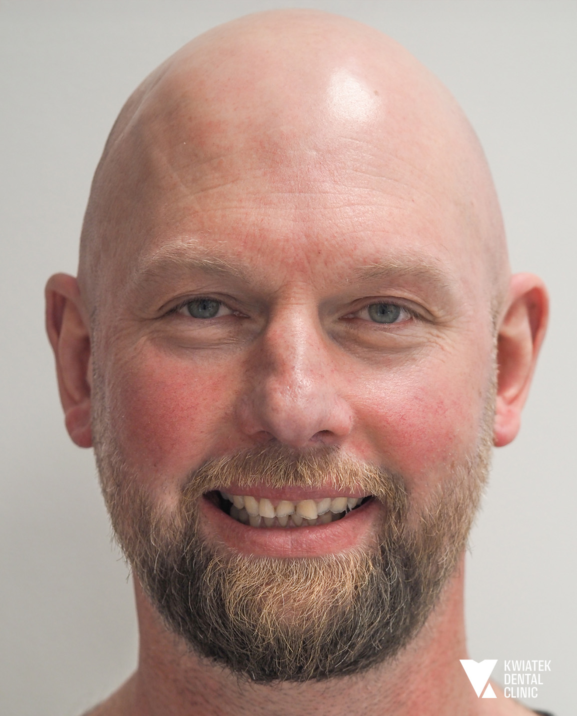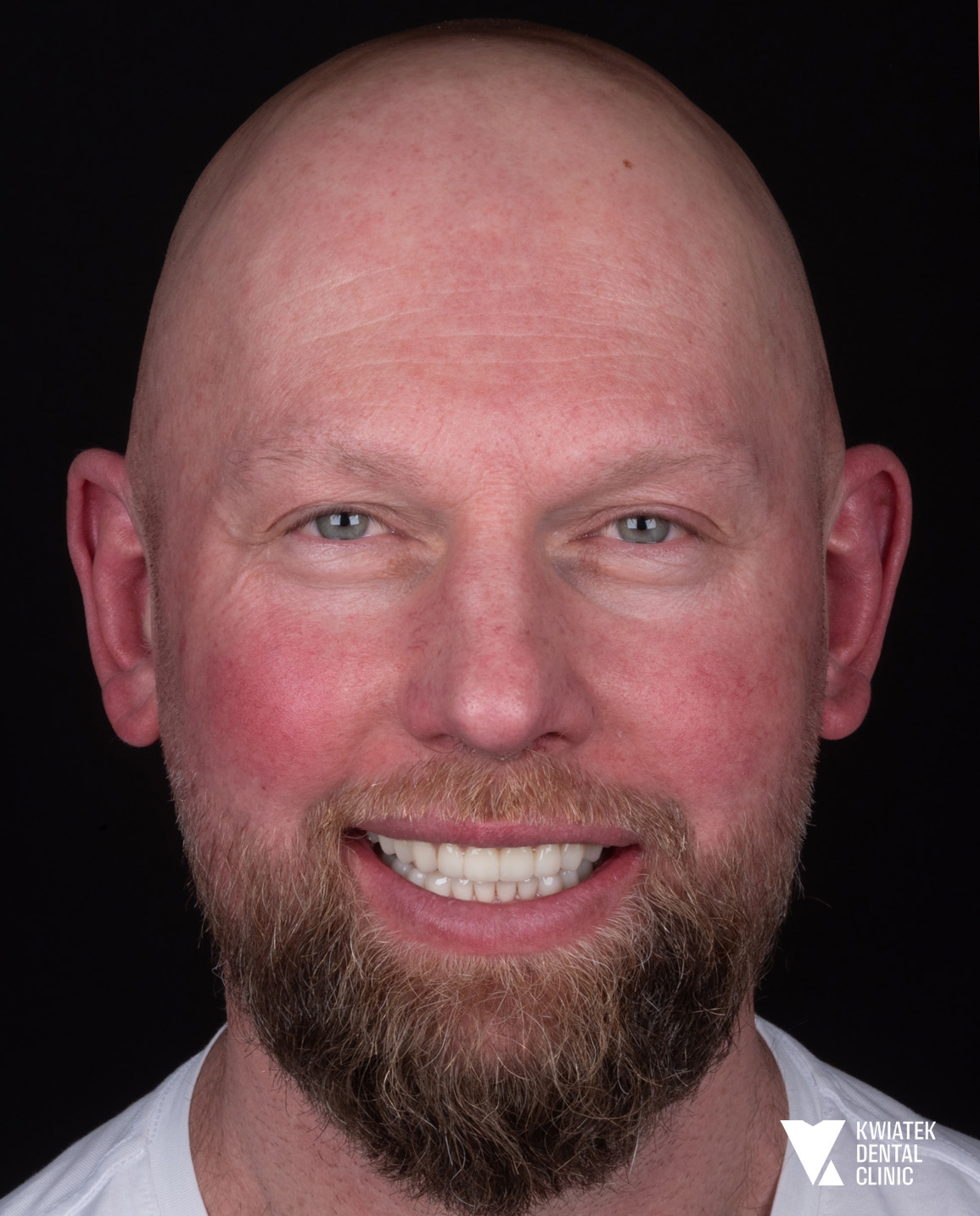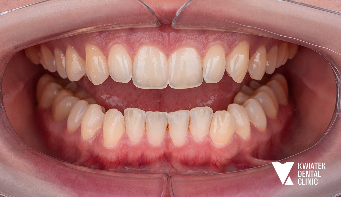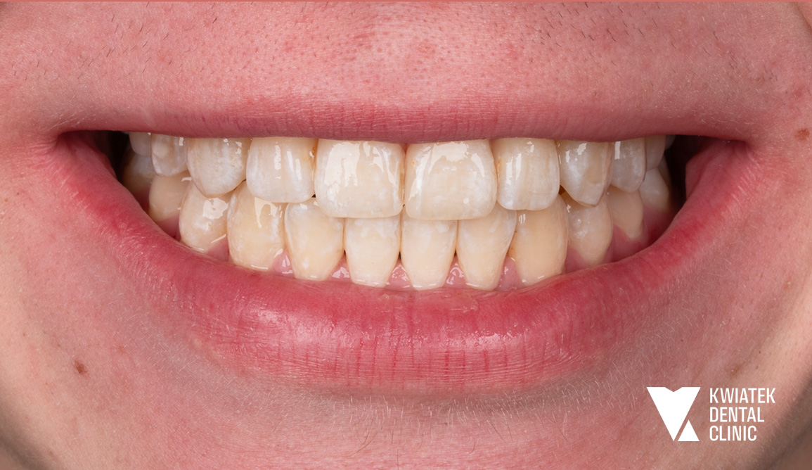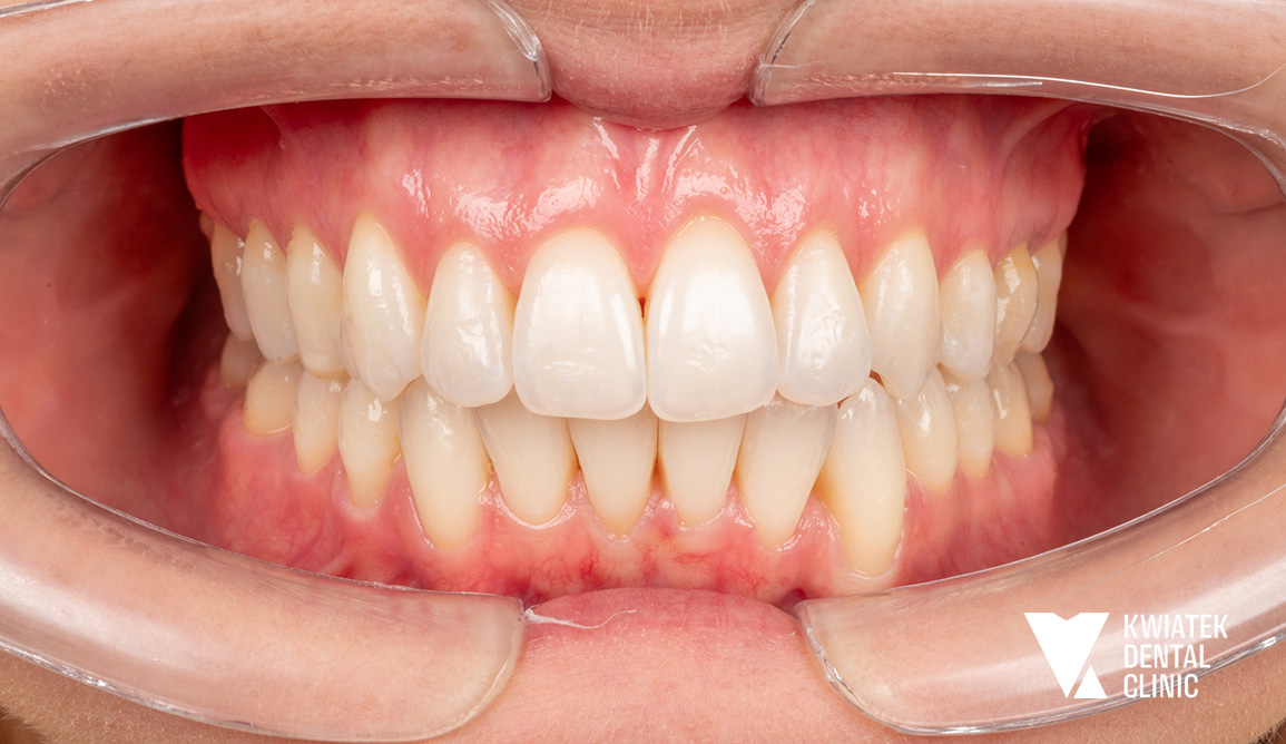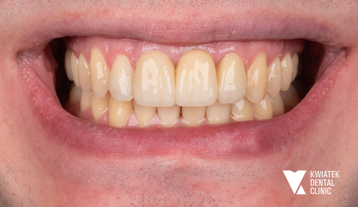 Dzięki ogromnej determinacji Pacjenta, który pomimo dużej odległości regularnie przyjeżdżał na zaplanowane wizyty, możliwe było przeprowadzenie kompleksowego leczenia, którego efektem jest doskonale zbalansowany zgryz oraz spektakularna i w pełni naturalna metamorfoza uśmiechu.