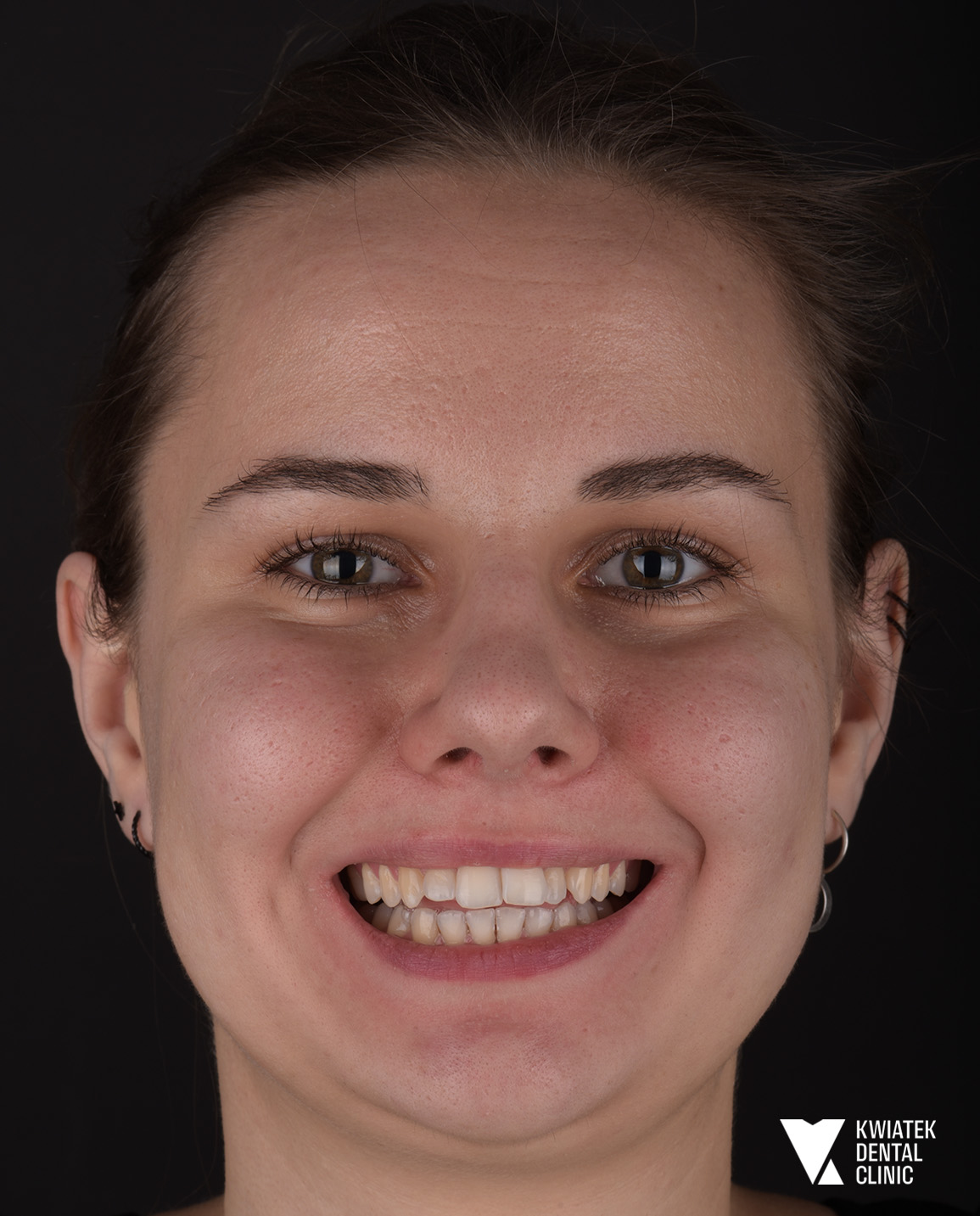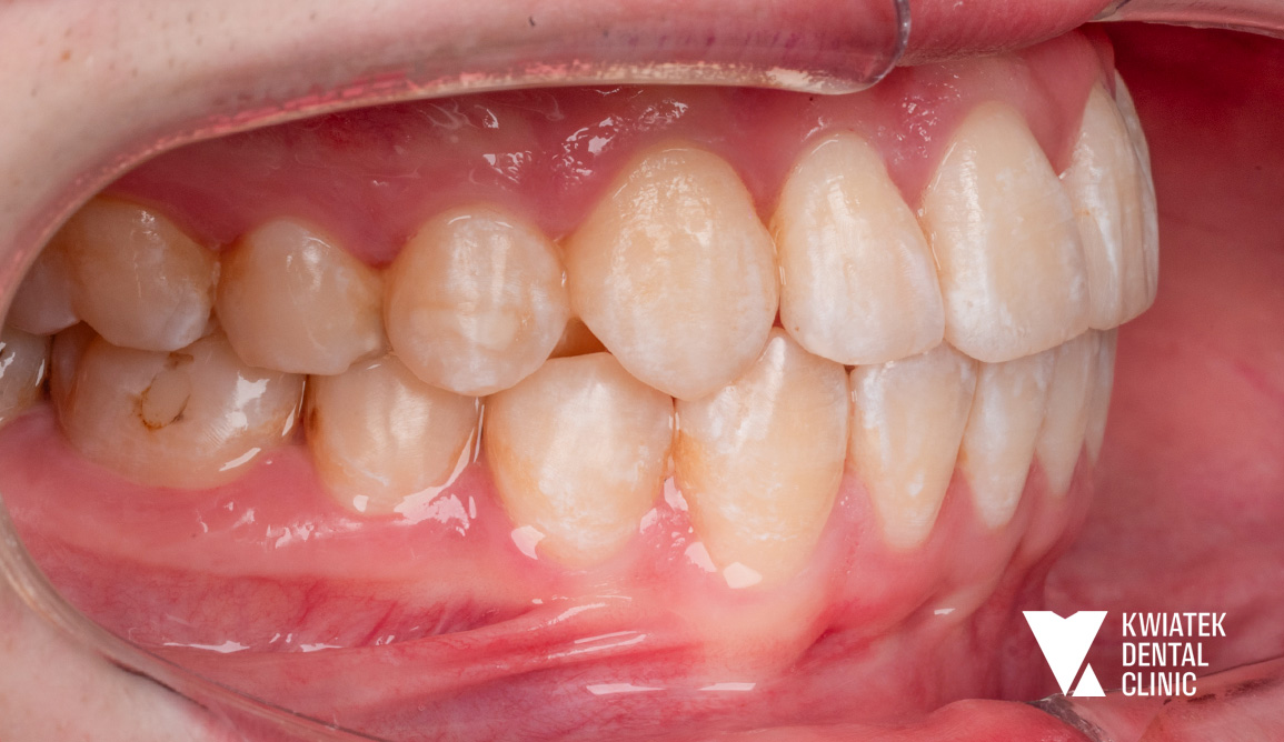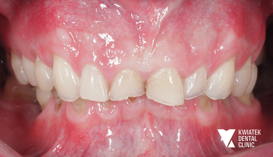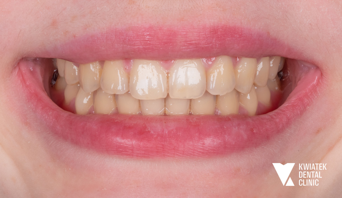 Pacjentka zgłosiła się na pierwszą konsultację stomatologiczną z licznymi wypełnieniami wymagającymi wymiany oraz ogniskami próchnicy. Leczenie rozpoczęto od kompleksowej diagnostyki i higienizacji, następnie przeprowadzono leczenie zachowawcze, odbudowę protetyczną zęba oraz zabiegi chirurgiczne, przygotowujące do dalszej terapii. Całość została zwieńczona leczeniem ortodontycznym aparatem nakładkowym oraz wybielaniem zębów, dzięki czemu uzyskano zdrowy, harmonijny i naturalnie estetyczny uśmiech.