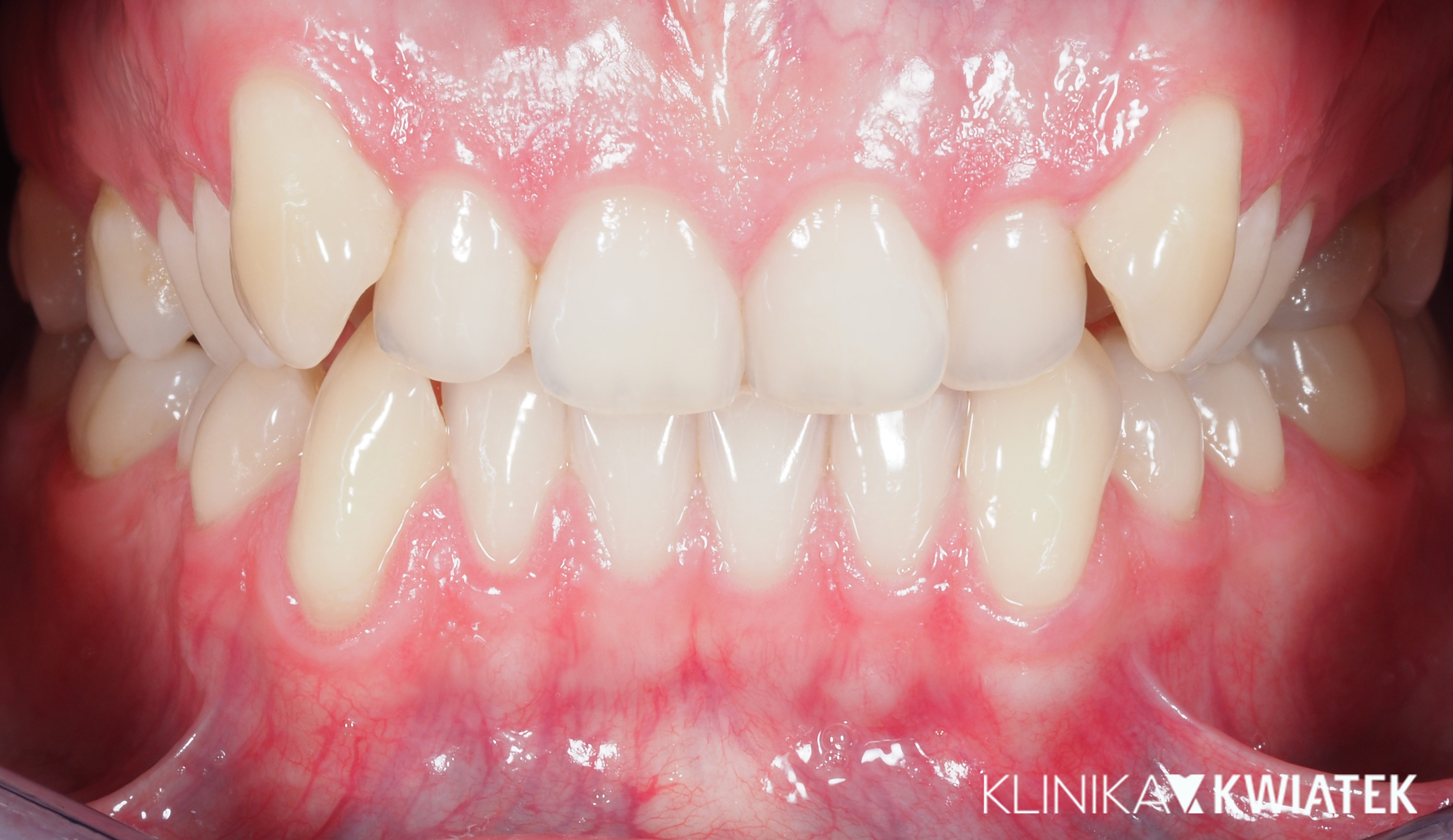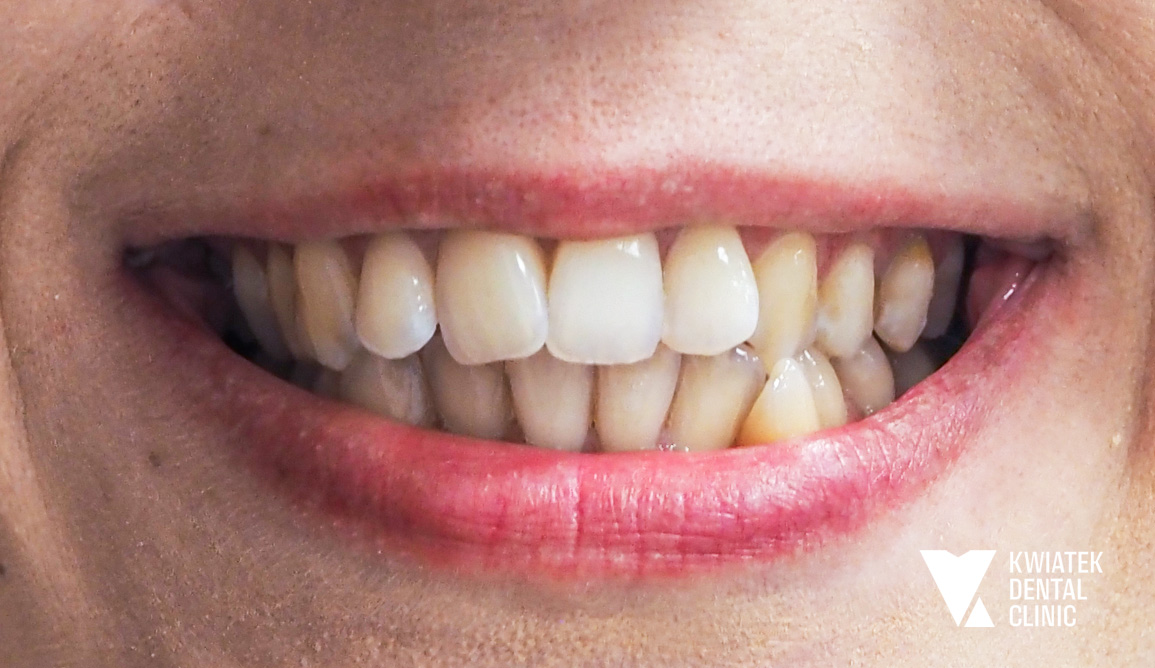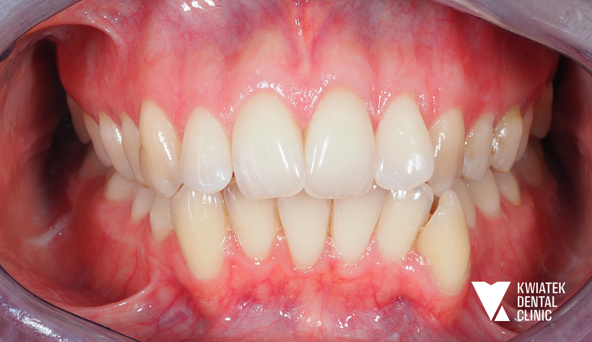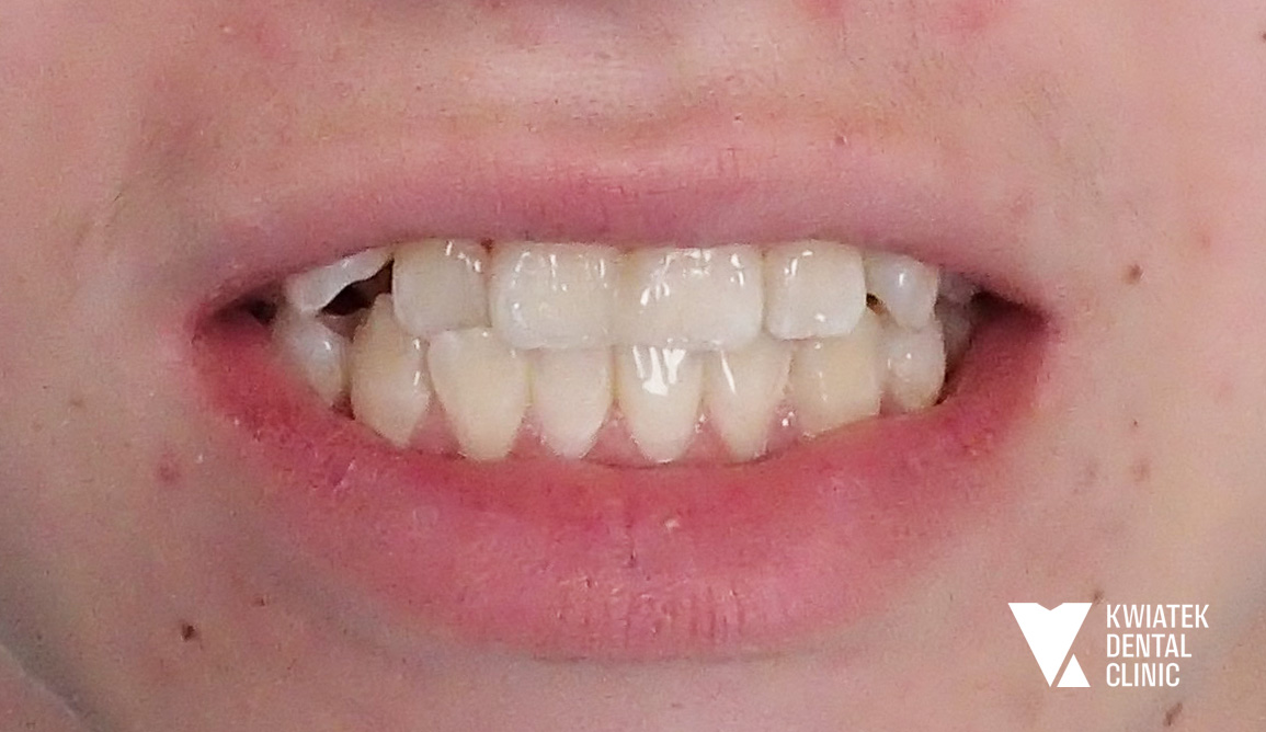 Do naszej kliniki zgłosiła się Pacjentka, która w przeszłości była już leczona ortodontycznie. Mimo wcześniejszego leczenia wciąż zmagała się z brakiem górnej dwójki oraz przesuniętą linią pośrodkową, co wpływało zarówno na estetykę uśmiechu, jak i na prawidłową funkcję zgryzu.