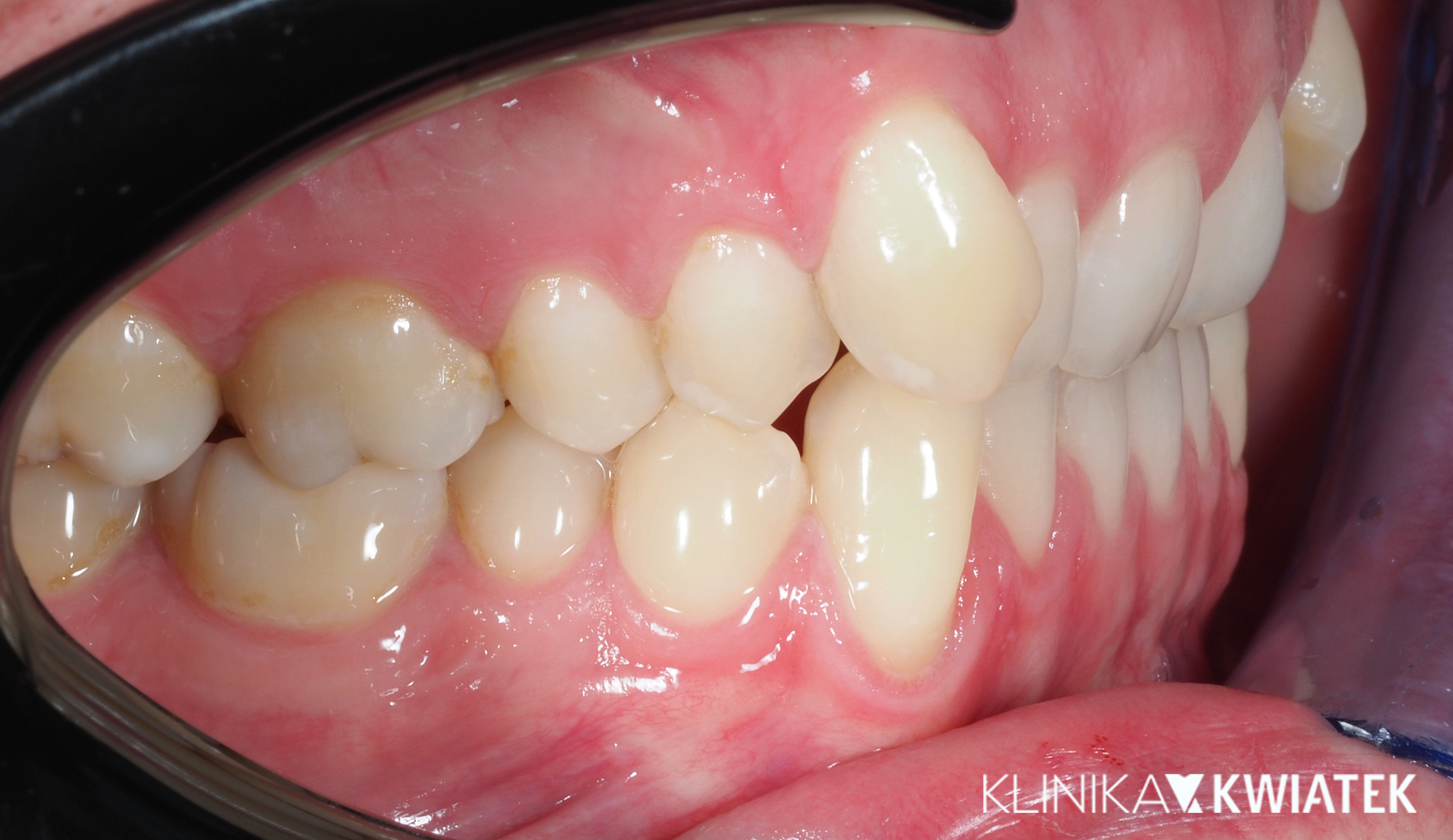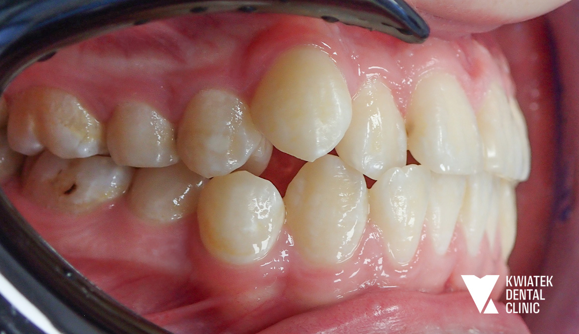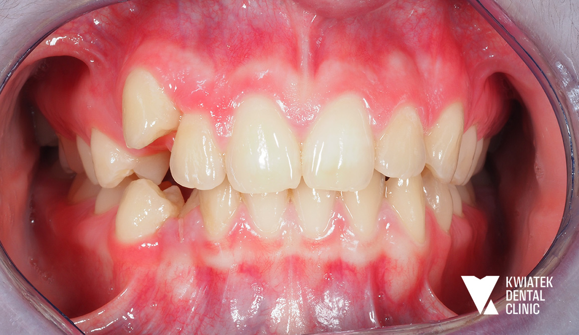 Pacjent zgłosił się na konsultację ortodontyczną z powodu nieprawidłowego ustawienia kła górnego oraz braku miejsca w łuku zębowym. Diagnostyka wykazała m.in. zgryz krzyżowy zęba 12, wychylenie zęba 13 oraz deficyt przestrzeni w szczęce.