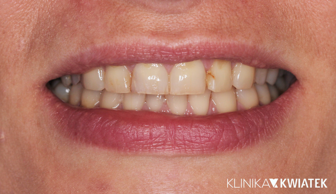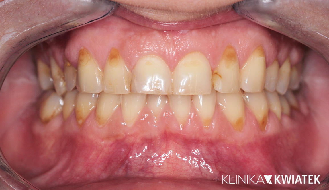Pacjentka zgłosiła się z problemem recesji dziąseł, wadą zgryzu, brakiem zawiązka zęba 34 oraz potrzebami leczenia zachowawczego. Terapia obejmowała wieloetapowe, kompleksowe leczenie: profesjonalne higienizacje, leczenie zachowawcze, ortodoncję nakładkową, zabiegi chirurgiczne oraz implantację z odbudową protetyczną. Efektem jest zdrowy, stabilny zgryz, prawidłowe warunki przyzębia oraz estetyczna i funkcjonalna odbudowa brakującego zęba.