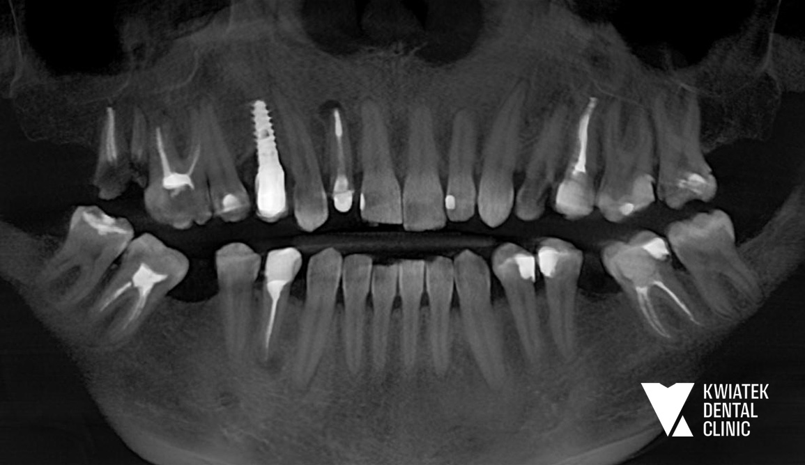 Diagnostyka była prowadzona etapowo z wykorzystaniem tomografii CBCT, skanów wewnątrzustnych oraz dokumentacji radiologicznej i fotograficznej, co pozwoliło na precyzyjne planowanie leczenia w perspektywie długoterminowej.