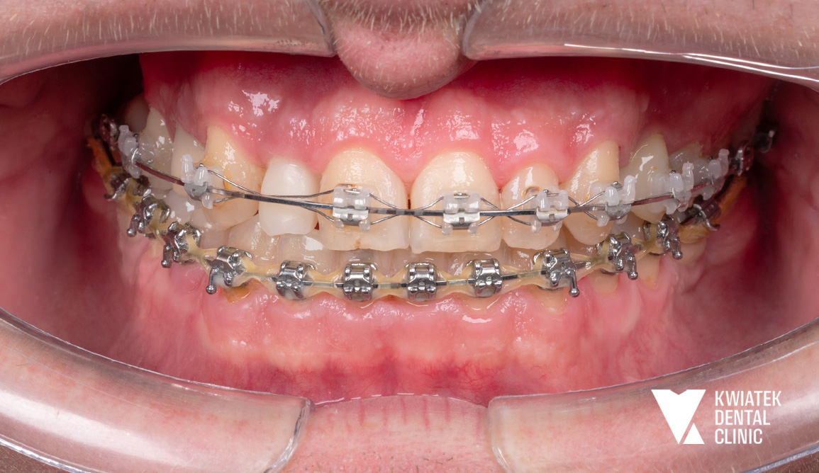 Po odbudowie fundamentów rozpoczęto leczenie ortodontyczne, którego celem była korekta ustawienia zębów i przygotowanie optymalnych warunków dla finalnej estetyki.