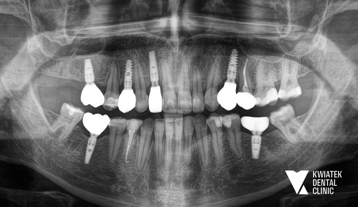 Rozpoczęto od zabiegów chirurgicznych i usunięcia zębów niekwalifikujących się do leczenia. Następnie wdrożono zaawansowane procedury implantologiczne, w tym natychmiastowe implantacje oraz zabiegi augmentacji kości z użyciem biomateriałów.