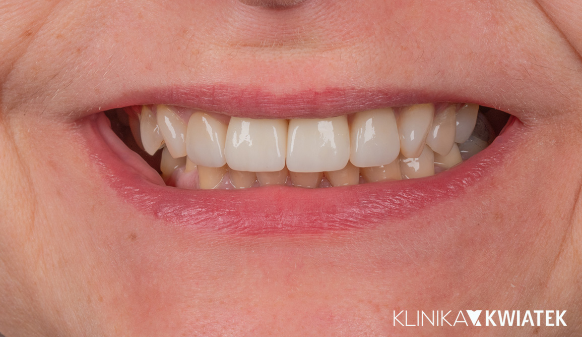 Pacjentka zgłosiła się z rozległymi brakami zębowymi oraz nieszczelnymi, nieestetycznymi pracami protetycznymi, które nie spełniały już swojej funkcji. Zależało jej na kompleksowej poprawie wyglądu uśmiechu, ale także na przywróceniu prawidłowej funkcji żucia i komfortu.