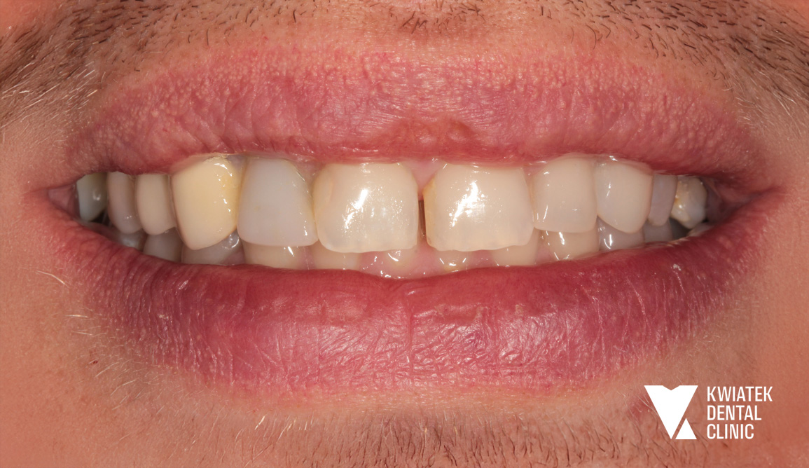 Pacjent zgłosił się do kliniki z zaawansowanymi problemami stomatologicznymi: licznymi ubytkami próchnicowymi, brakami zębowymi, starciem zębów oraz zaburzeniami zwarcia. Leczenie obejmowało kompleksową diagnostykę, leczenie zachowawcze i endodontyczne, zabiegi chirurgiczne, implantację oraz wieloetapową odbudowę protetyczną. Efektem terapii jest perfekcyjnie zbalansowany zgryz, najwyższy komfort funkcjonowania oraz naturalnie piękny uśmiech, który podkreśla indywidualny charakter pacjenta i pozwala mu w pełni cieszyć się nim każdego dnia.