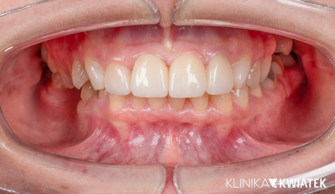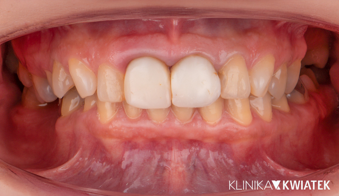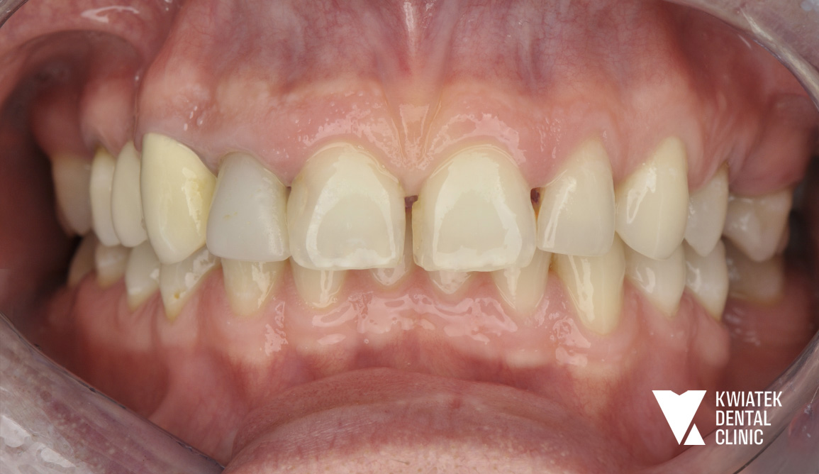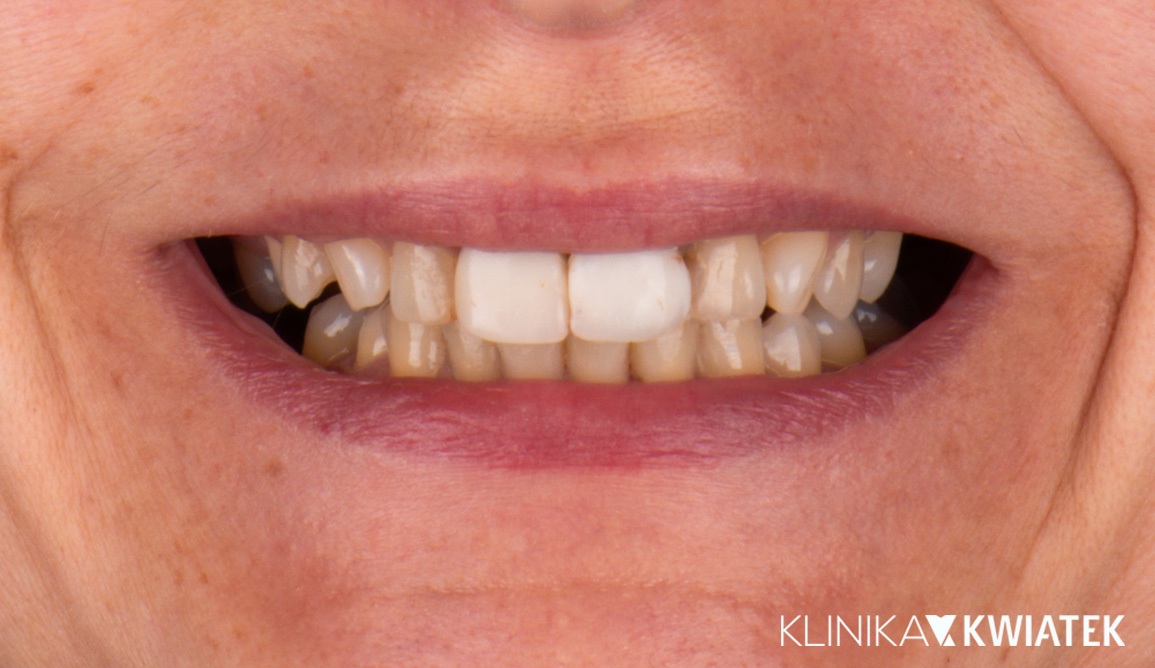 Pacjentka zgłosiła się do kliniki z powodu starych, nieszczelnych i ruchomych odbudów kompozytowych na górnych jedynkach, które powodowały znaczny dyskomfort estetyczny. Szczegółowa diagnostyka wykazała niestabilność wkładów koronowo-korzeniowych oraz nieodwracalną destrukcję tkanek twardych, kwalifikującą zęby 11 i 21 do ekstrakcji. Dzięki indywidualnie opracowanemu planowi leczenia możliwe było przeprowadzenie kompleksowej odbudowy implantologiczno-protetycznej, przywracającej naturalny wygląd, prawidłową funkcję oraz pełen komfort uśmiechu.