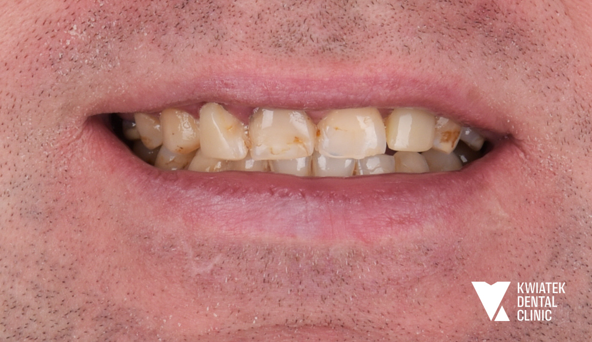 Pan Rafał jest naszym Pacjentem od ponad 12 lat, a jego historia to przykład leczenia opartego na zaufaniu, konsekwencji i długofalowym podejściu do zdrowia. Zgłosił się z rozległymi problemami obejmującymi zniszczone zęby, braki oraz zaburzenia zgryzu, wymagające kompleksowego leczenia. Dzięki wieloetapowej terapii stworzyliśmy stabilny, funkcjonalny i estetyczny uśmiech, który jest efektem wspólnej pracy na przestrzeni lat.