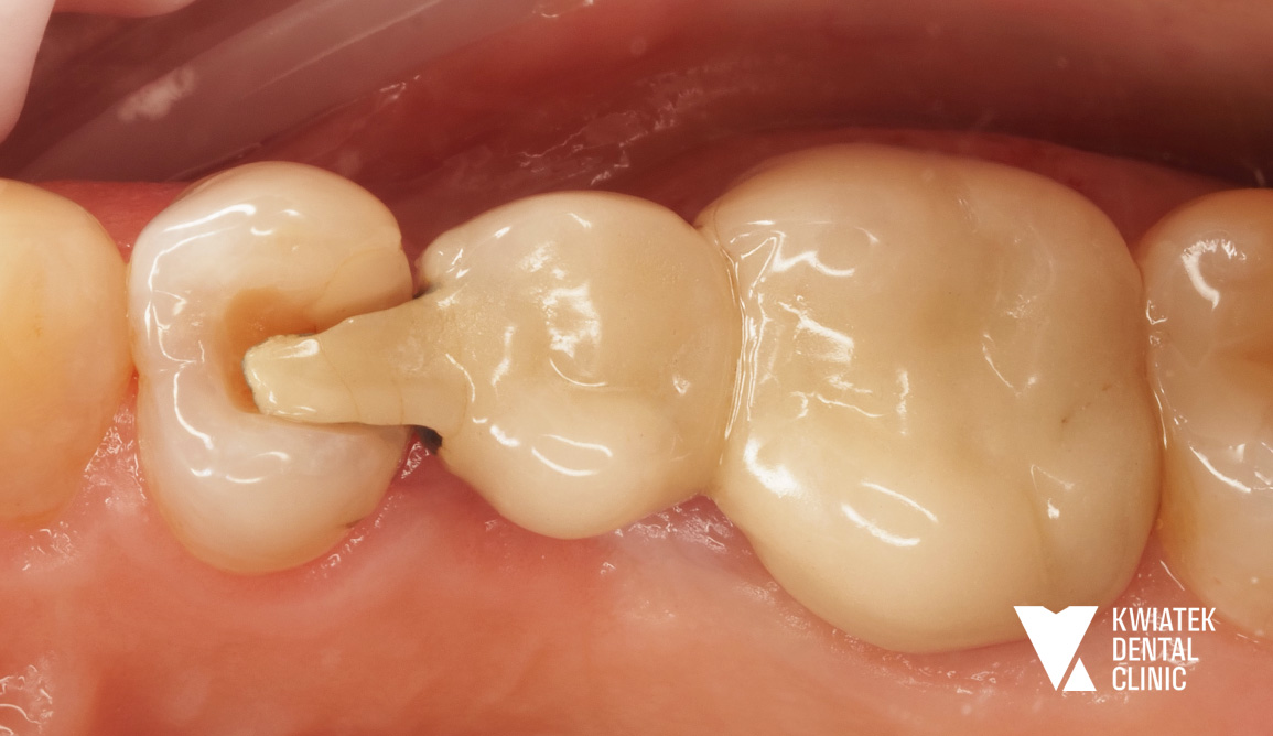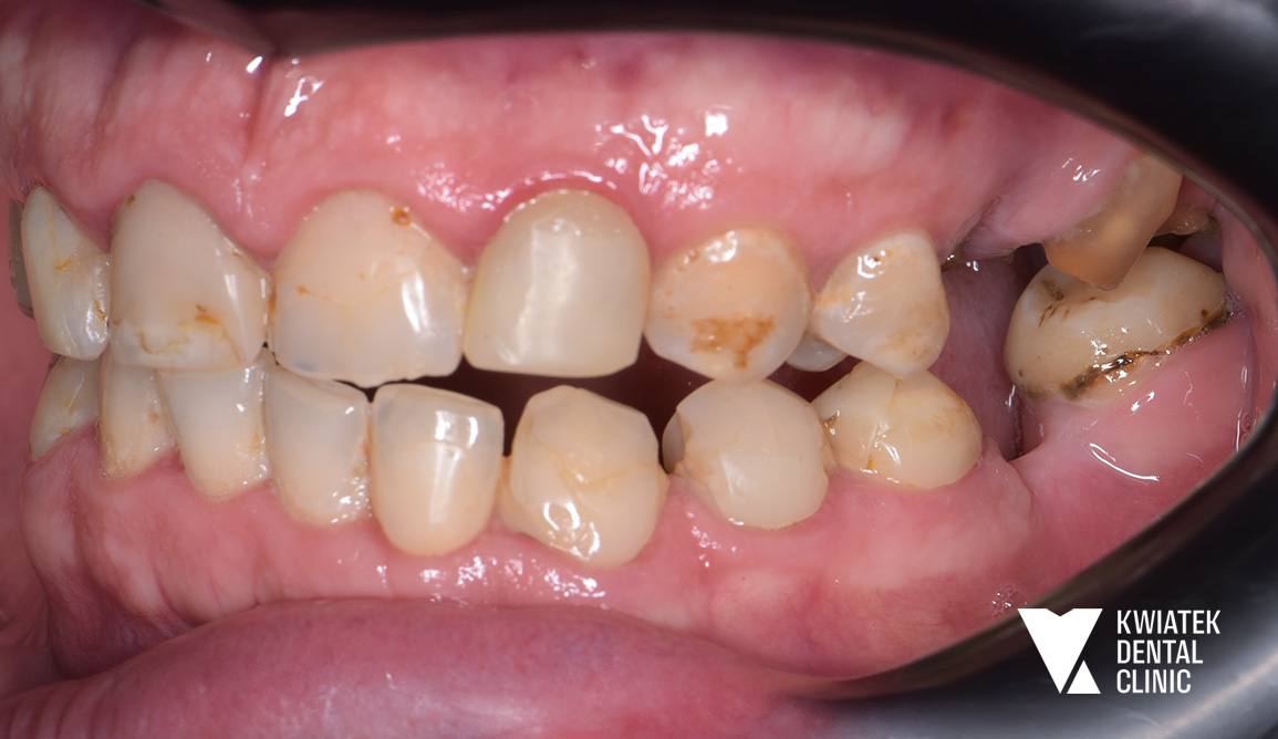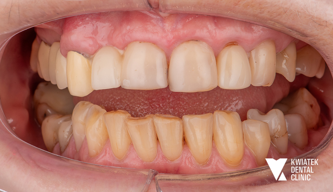 Pacjentka przez lata użytkowała starą pracę protetyczną w odcinku 16 do 14, która z czasem przestała spełniać zarówno funkcję estetyczną, jak i funkcjonalną. Po szczegółowej diagnostyce zaproponowano najnowocześniejsze i najbardziej przewidywalne rozwiązanie w postaci implantacji w miejscu brakującego zęba 15 oraz wykonanie nowych koron ceramicznych. Efektem jest trwała, komfortowa i naturalnie wyglądająca odbudowa, przywracająca prawidłowe warunki żucia i harmonię uśmiechu.